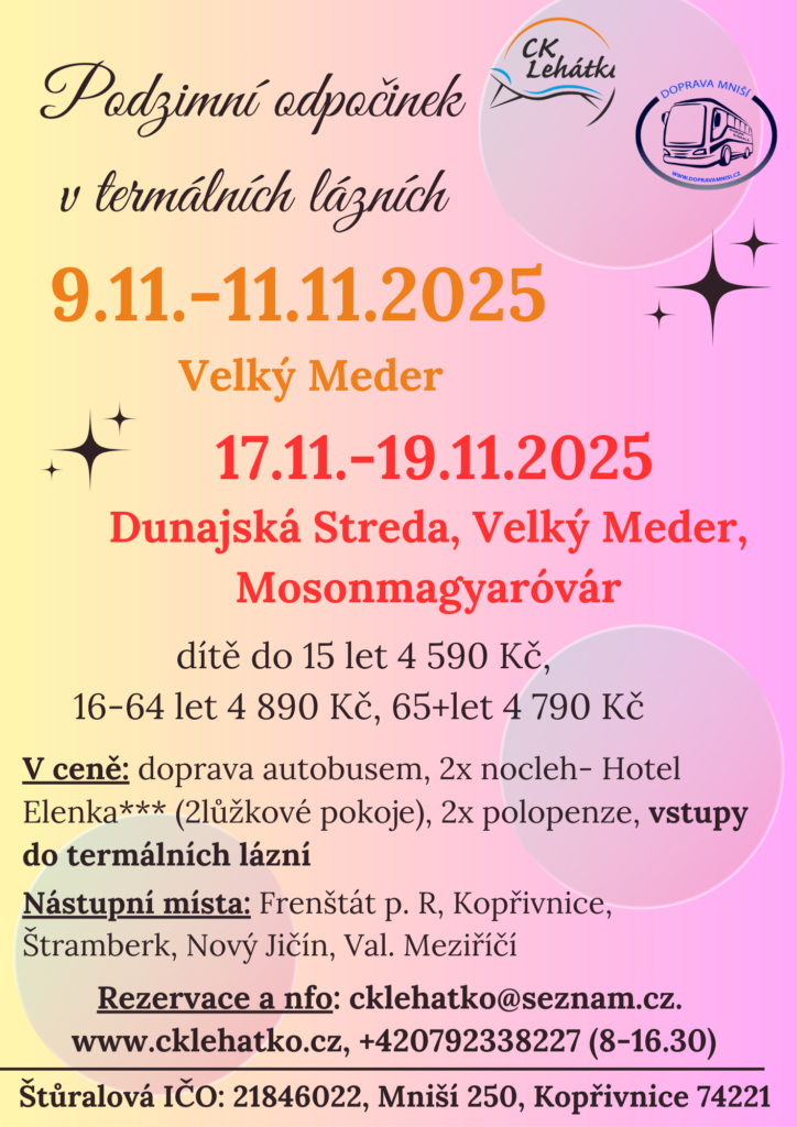 www. dopravamnisi.cz www.cklehatko.cz Autobusová doprava Mniší & Ck Lehátko Nabízíme dopravu komfortními autobusy s profesionální posádkou. Správná volba pro Vaše cesty. Aktuality CK Lehátko jako součást Doprava Mniší aktuální zájezdy na www.cklehatko.cz Víno a wellness Předchozí Další Tisíce najetých kilometrů s Dopravou Mniší Firma Doprava Mniší vznikla v roce 2019. Od té doby se náš vozový park rozrostl na 5 komfortní autobusy pro 20 až 61 osob. Profesionální a zkušená posádka je samozřejmostí a zajišťuje tak bezpečný návrat z Vašich cest. Číst více Mercedes - Benz SprinterNabízíme dopravu 20+1 místným luxusním autobusem. Televize, klimatizace, polohovatelna sedadla. Číst více Připravili jsme pro Vás nový autobusPřipravili jsme pro Vás nový autobus Číst Více Zapůjčení cyklo vozíkuCyklistické zájezdy jsou velice oblíbené a měli jsme možnost procestovat spoustu krásných míst. Číst více S kým spolupracuji: